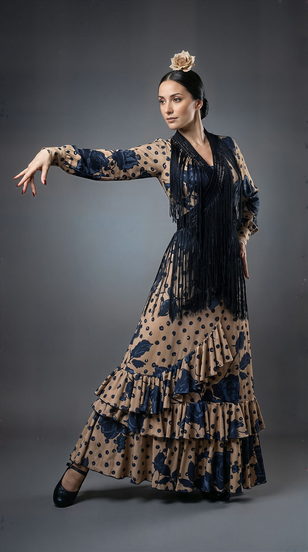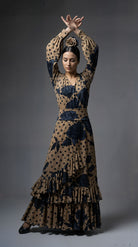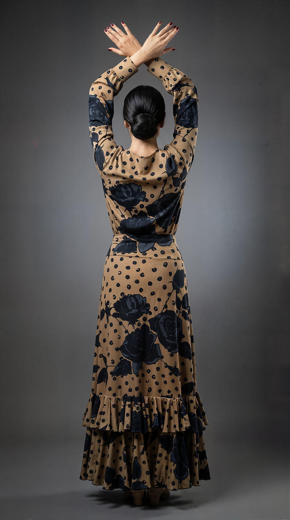 Completo flamenco composto da blusa e gonna, realizzato in jersey stampato elasticizzato. Fantasia a rose nere e grigie su fondo sabbia caldo