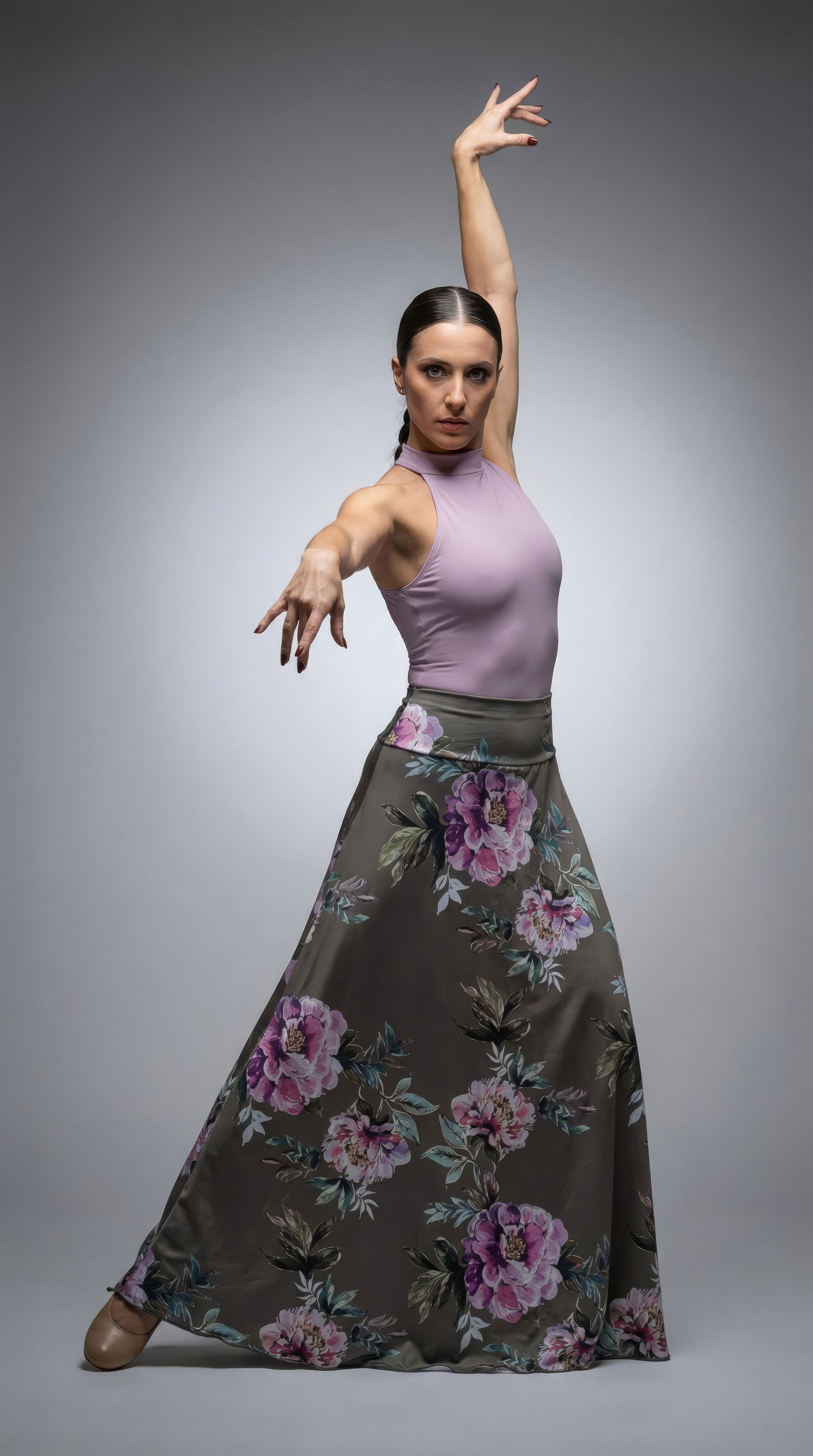 Realizzata in morbido jersey di poliestere elasticizzato, la gonna flamenca Luna si distingue per il fronte in fantasia e il retro in tinta unita, con un unico godet centrale sul retro che dona movimento e armonia alla linea.