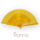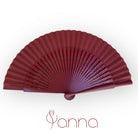 Abanico abierto de madera lacada con varillas perforadas. Un accesorio ligero y duradero, disponible en varios colores.
