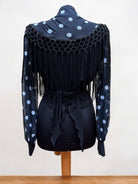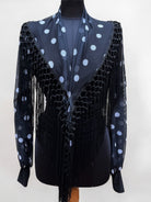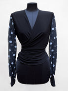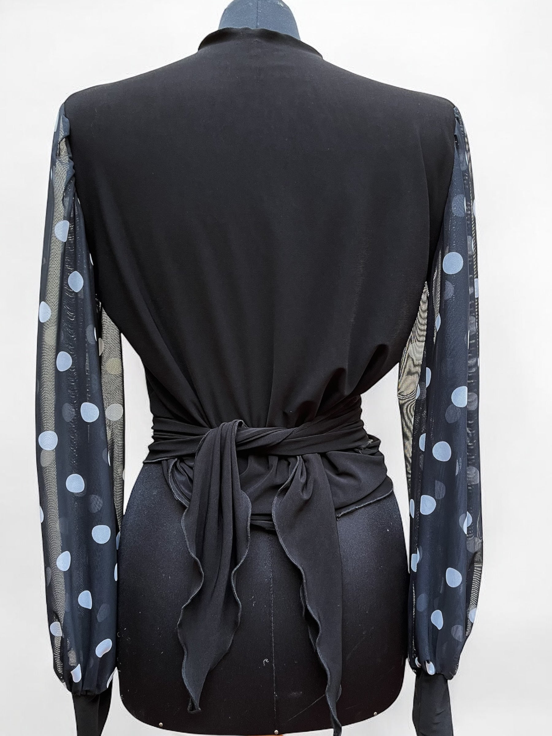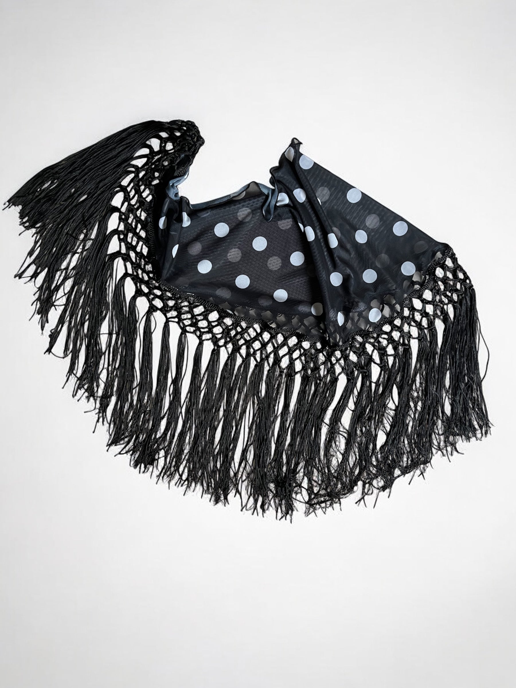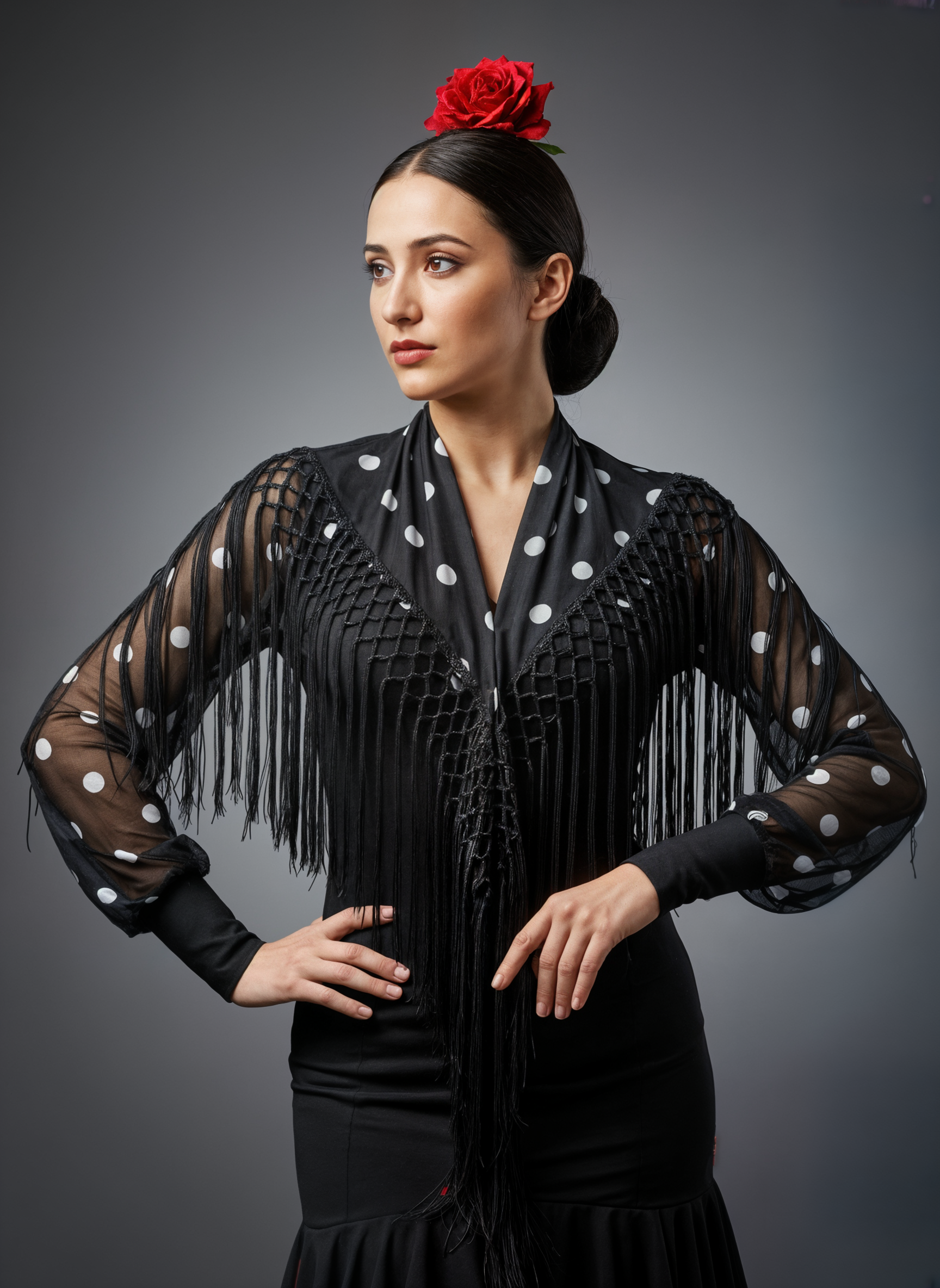 Una prenda elegante y dramática que combina tradición y modernidad , diseñada para el baile flamenco. Confeccionada en jersey elástico negro , destaca por su refinado contraste con las mangas de tul elástico negro con lunares blancos , que le aportan ligereza y carácter.