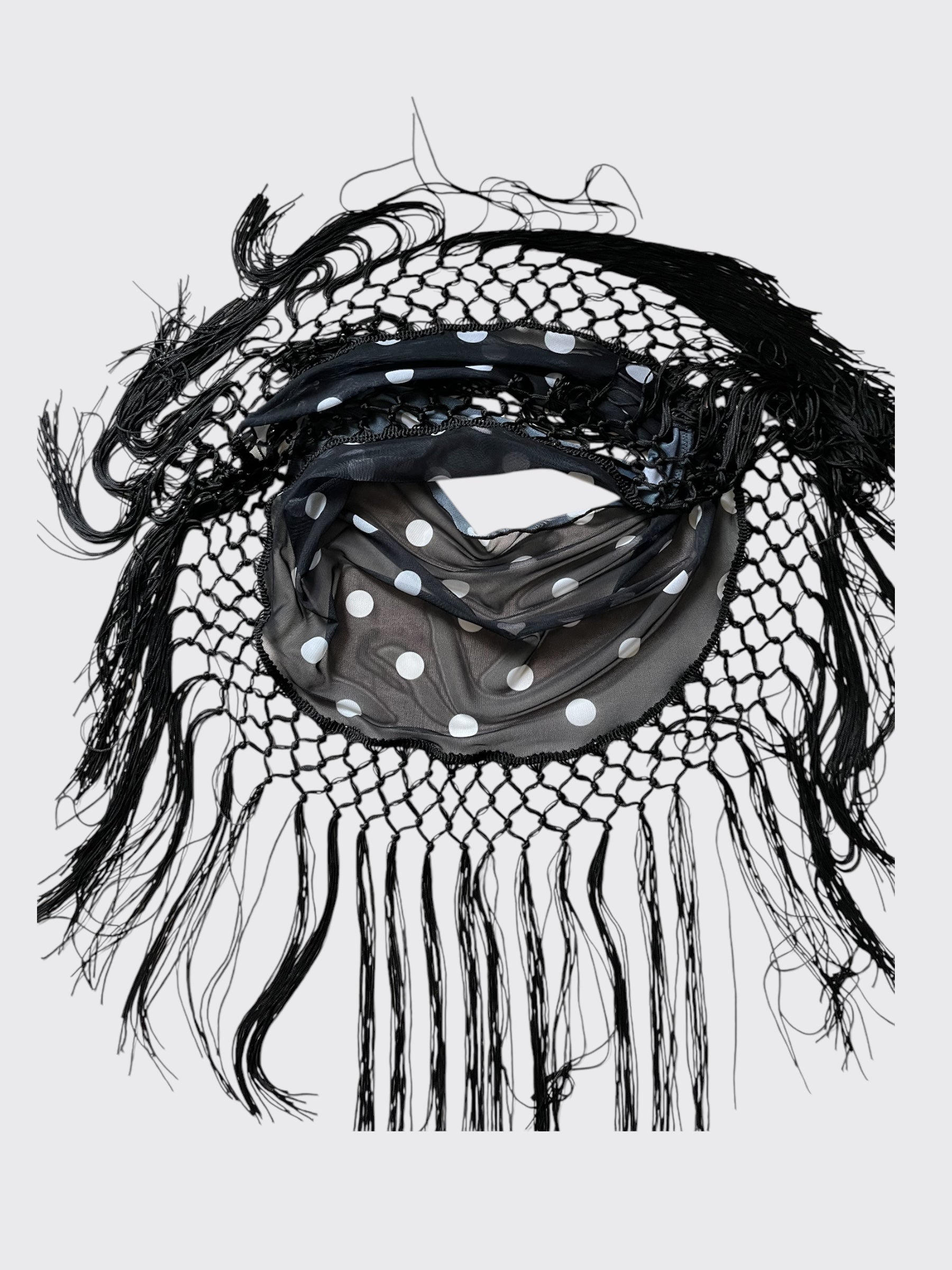 • Mangas largas y anchas de tul elástico negro con lunares blancos, rematadas con puños de punto negros.