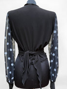 Mangas largas y anchas de tul elástico negro con lunares blancos, rematadas con puños de punto negros.