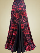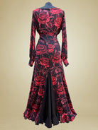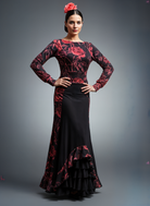 Un elegante traje de baile flamenco , confeccionado en tejido elástico para mayor comodidad y sofisticación. El diseño está adornado con un motivo floral de grandes rosas rojas con hojas oscuras sobre fondo negro, para un efecto dramático y auténtico.