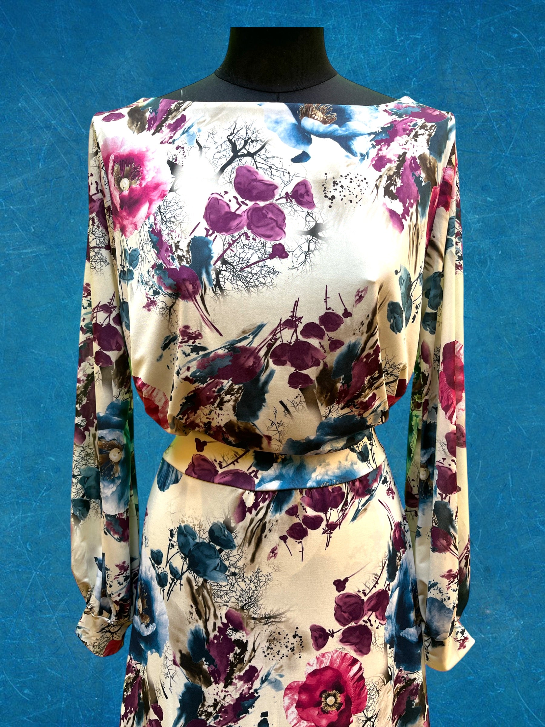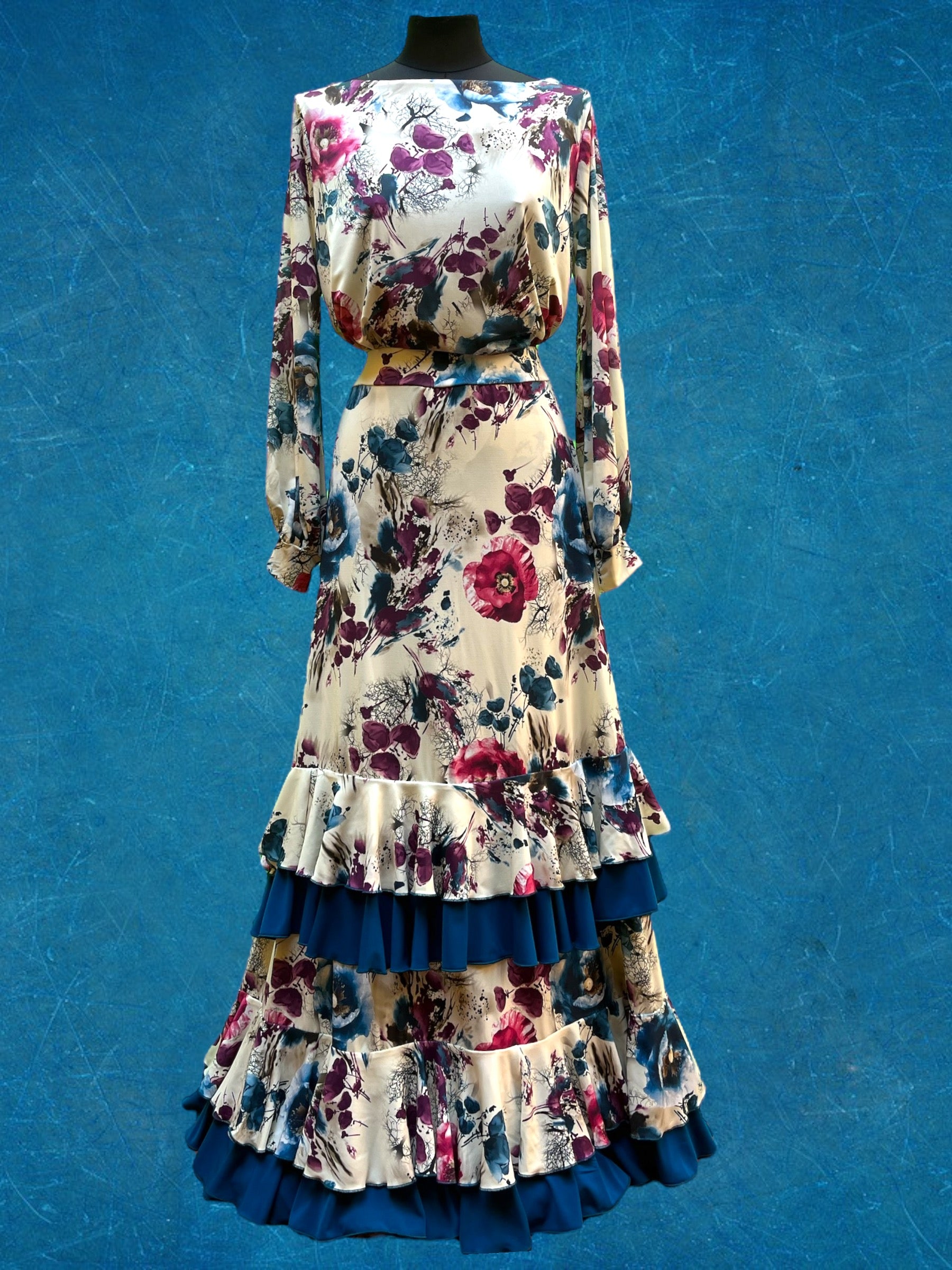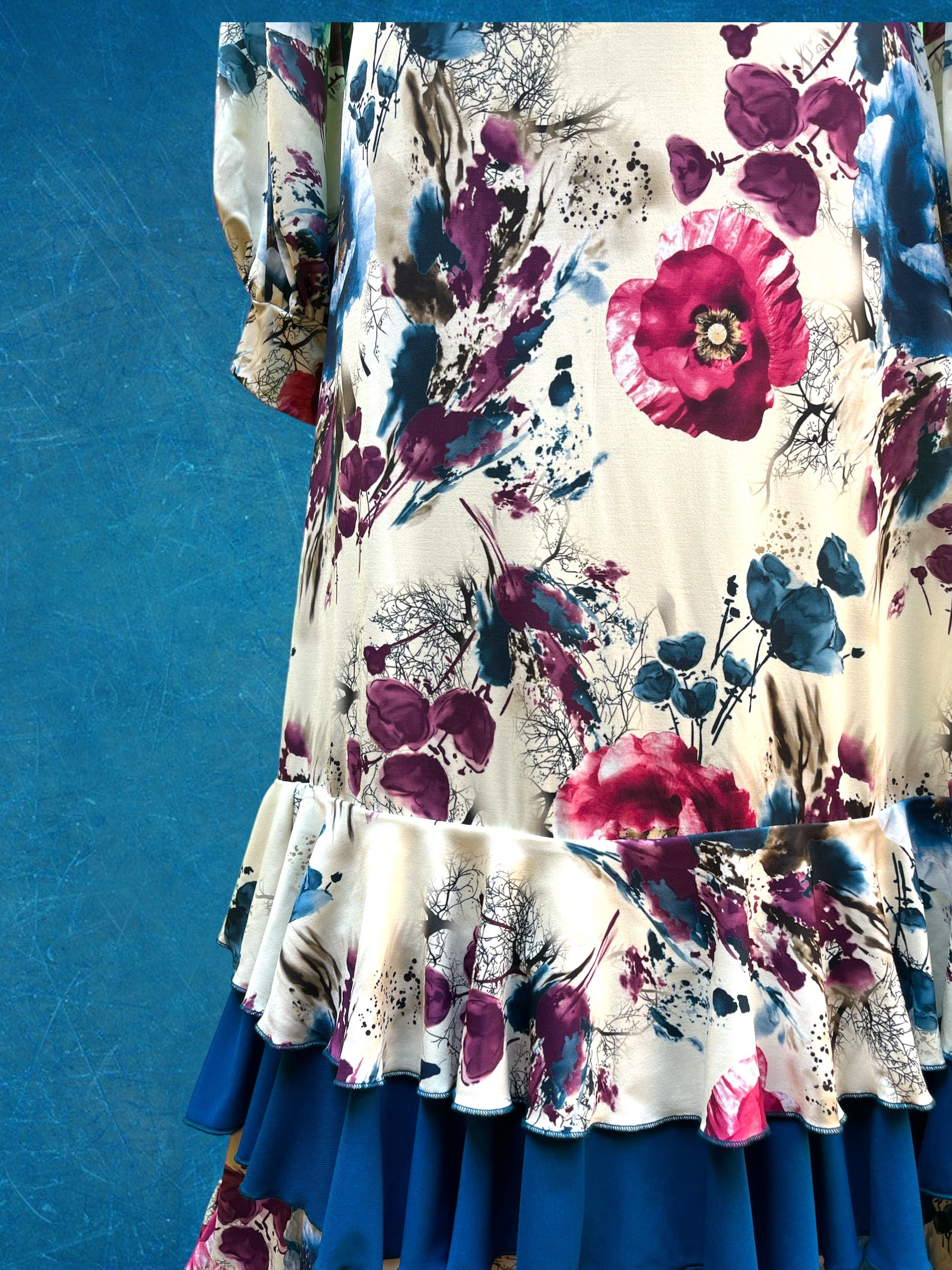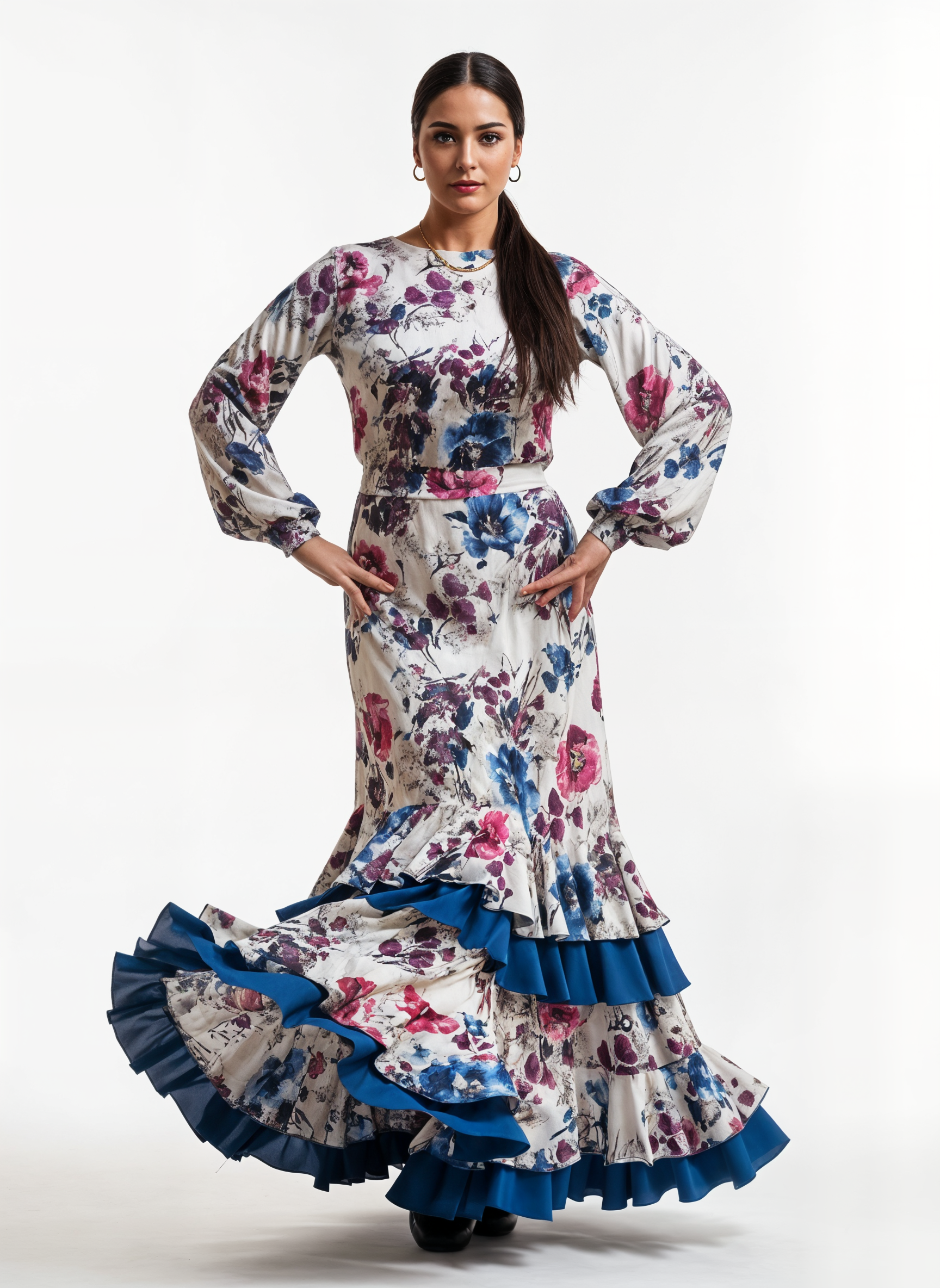 Un elegante y espectacular traje de baile flamenco , confeccionado en tejido elástico para mayor comodidad y libertad de movimiento. El diseño presenta un vibrante estampado floral en tonos magenta, azul y morado sobre un delicado fondo crema.