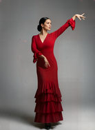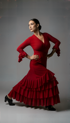 Confeccionada en suave jersey elástico, la falda flamenca Isabel destaca por su línea suave y envolvente que llega hasta la rodilla, donde se abre en una cascada de volantes que aportan volumen y movimiento.