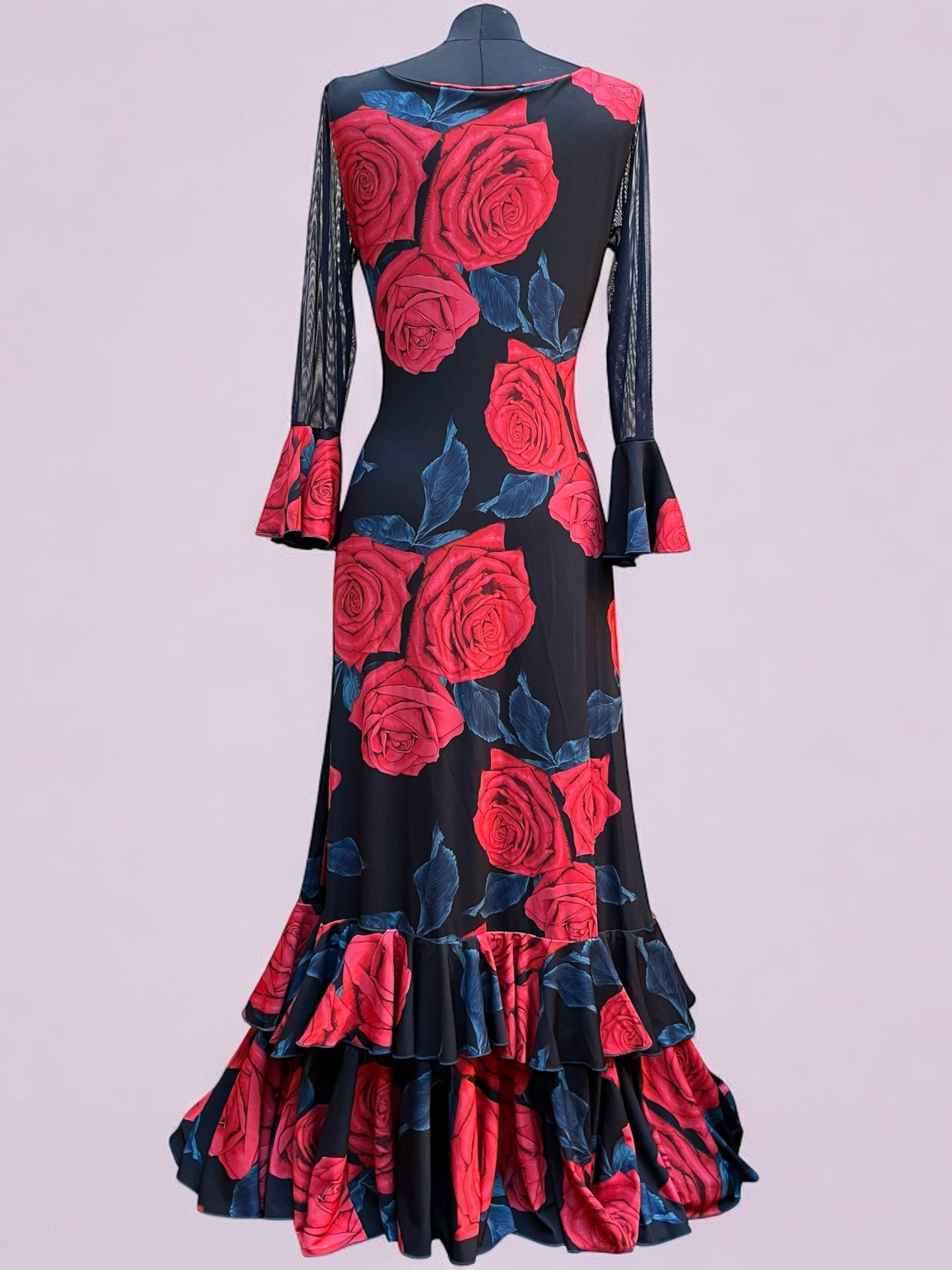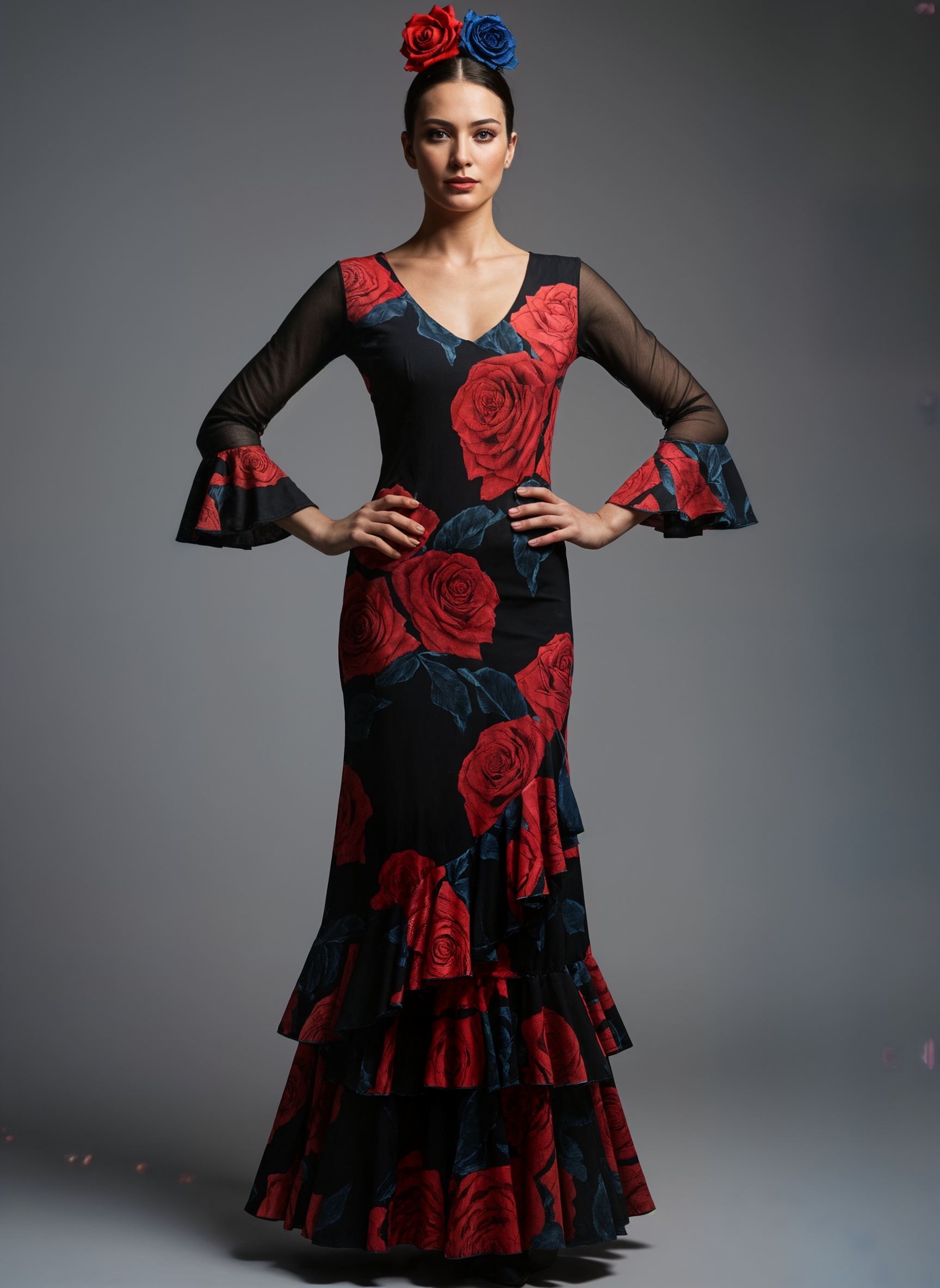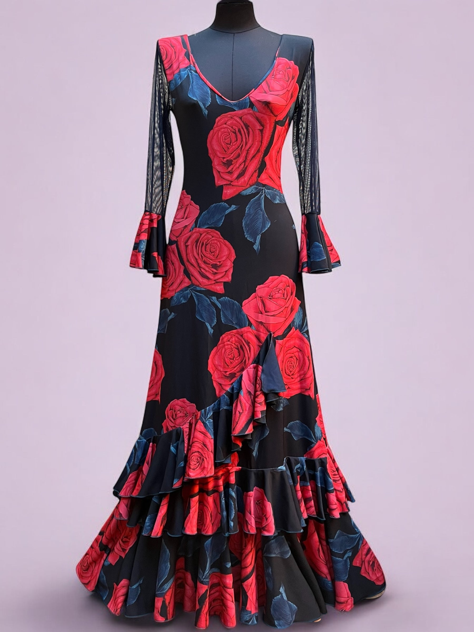 La falda acampanada de ancho medio está enriquecida por dos volantes y una elevación delantera , que amplifica el efecto escénico durante el baile.