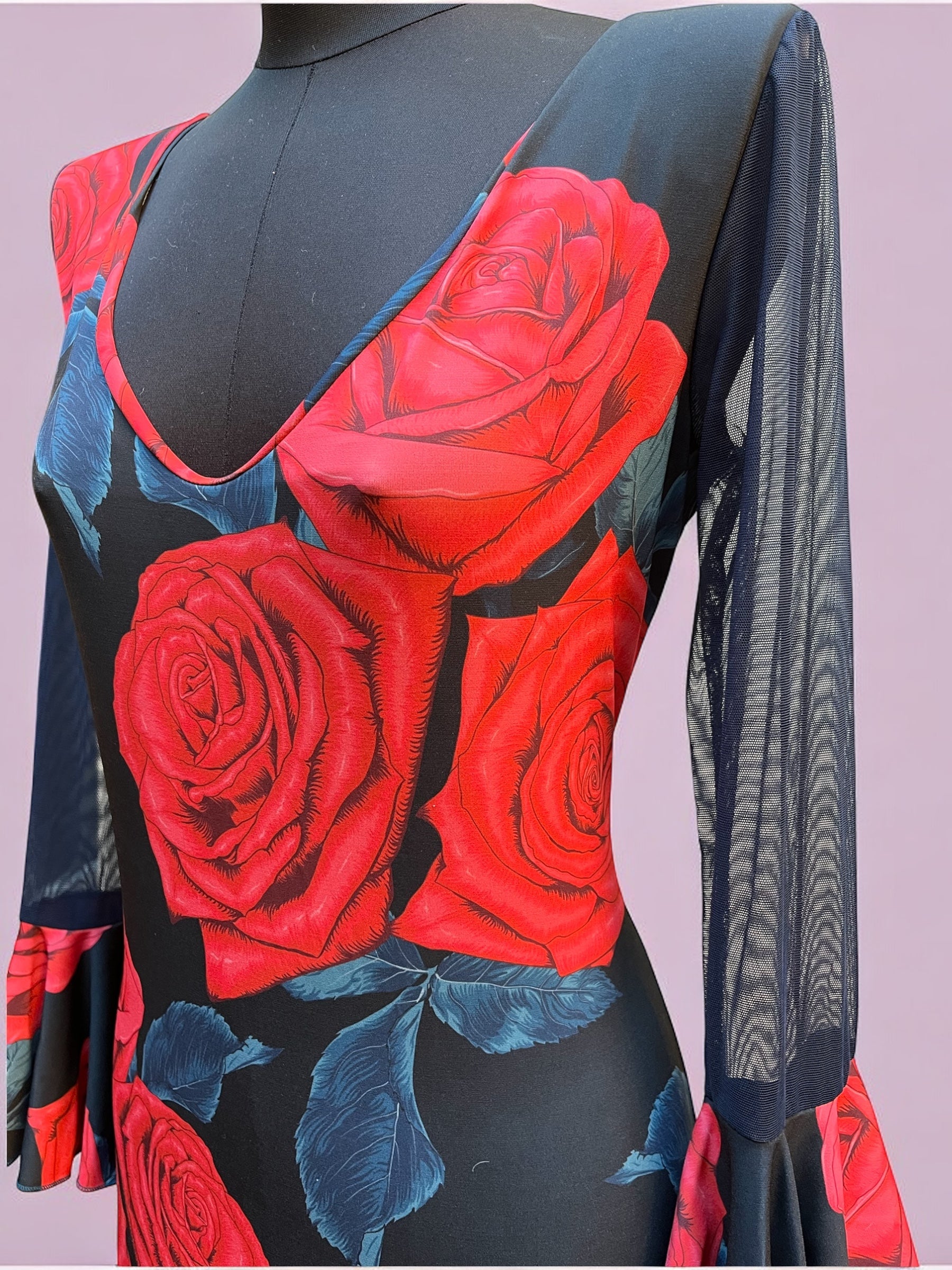Confeccionado en jersey elástico , este vestido cautiva con su elegante estampado de grandes rosas rojas sobre un refinado fondo azul oscuro , que también se extiende hasta la espalda para una apariencia impecable en movimiento.