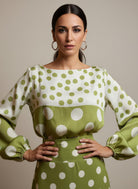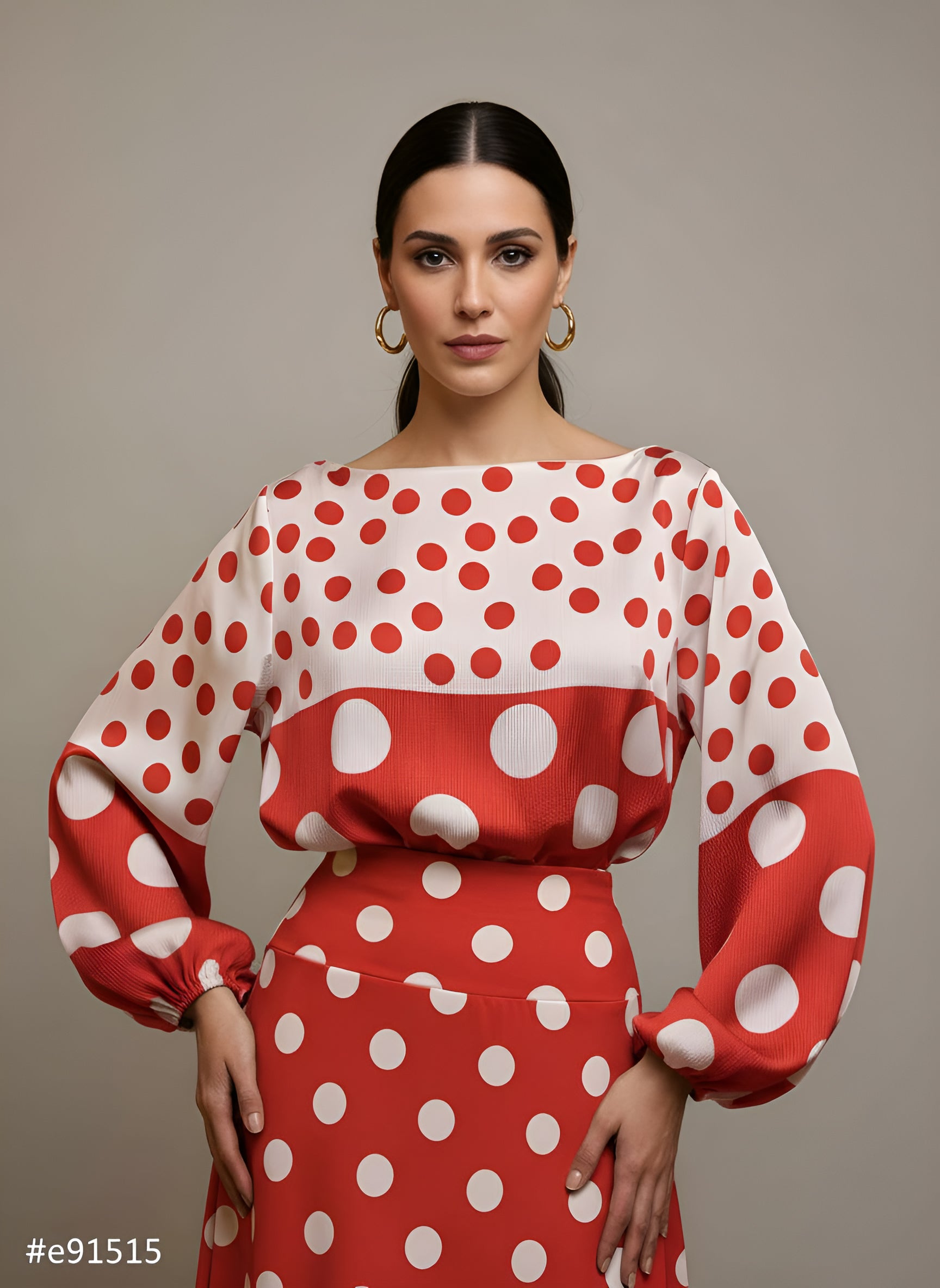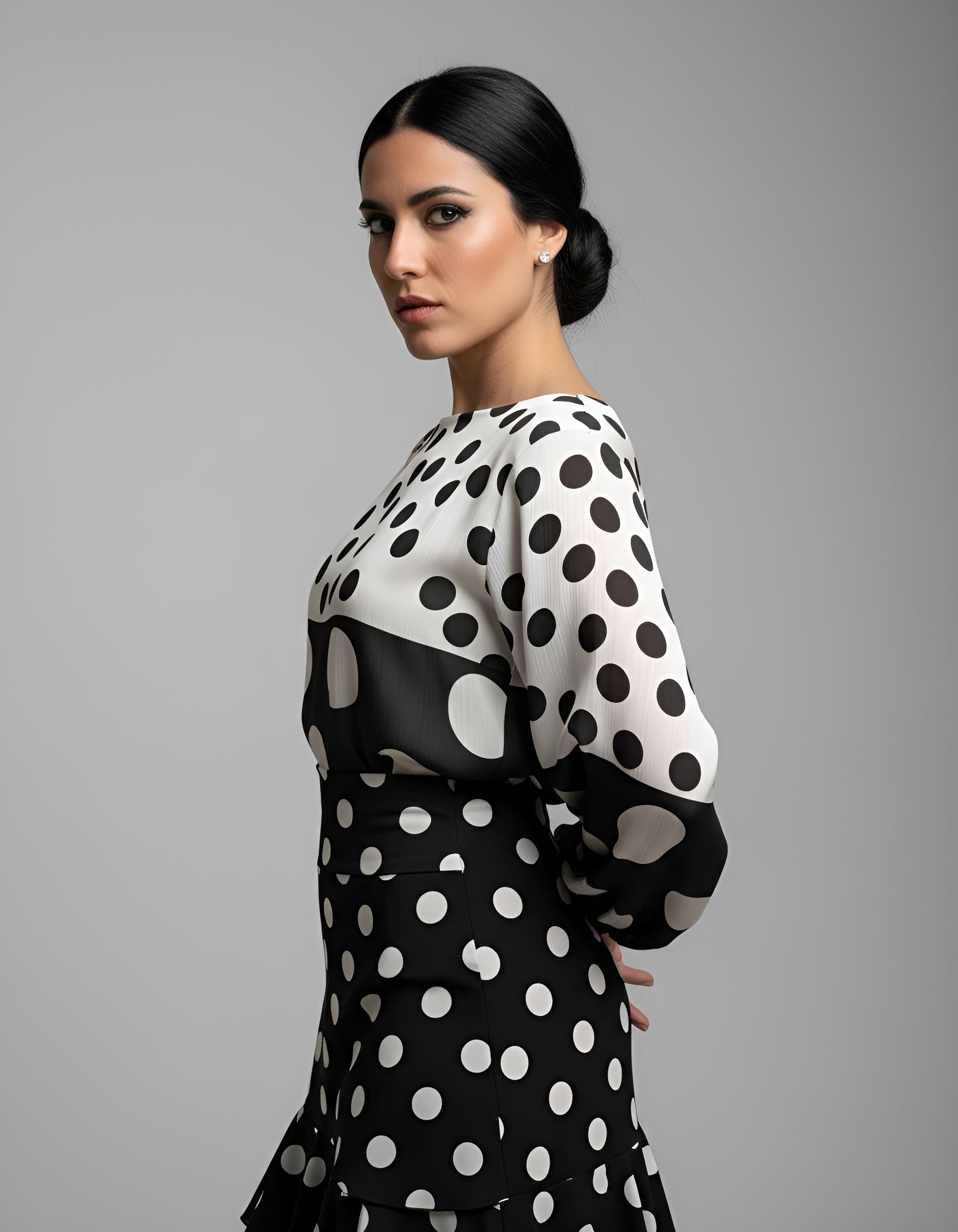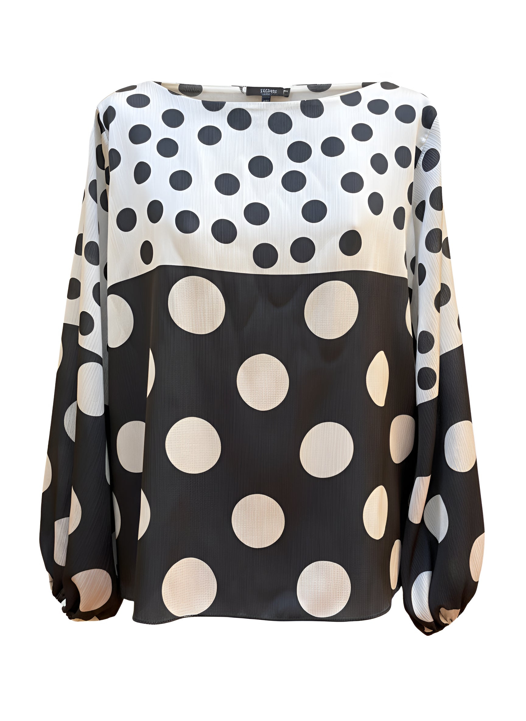 La blusa Triana si distingue per la sua linea fluida e il raffinato gioco di pois. Lo scollo a barchetta arrotondato incornicia delicatamente il décolleté, mentre le maniche ampie con elastico al polso creano movimento e leggerezza. La doppia stampa di pois grandi e piccoli, caratteristica distintiva della collezione Triana, dona un tocco vivace e armonioso.