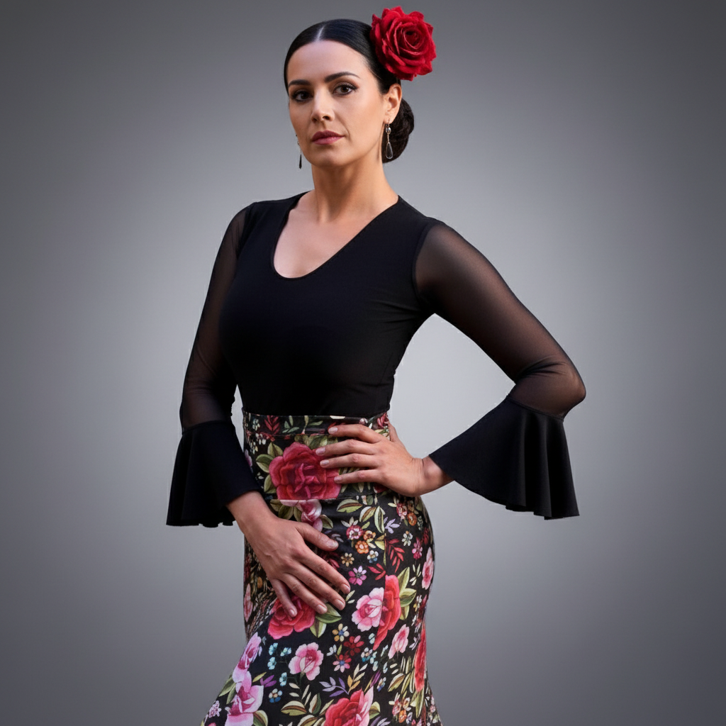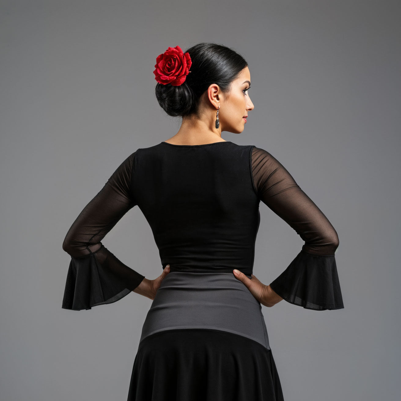 Elegante y versátil, la blusa Soledad está confeccionada en suave jersey elástico para mayor comodidad y libertad de movimiento. Las mangas tres cuartos de tul elástico se abren en un amplio volante, dándole a la prenda un toque ligero y femenino. El escote en V realza la figura, mientras que la doble capa delantera y trasera garantiza un ajuste perfecto y una sujeción óptima. Un diseño refinado, ideal para completar con estilo tanto trajes de flamenca como looks más contemporáneos.