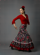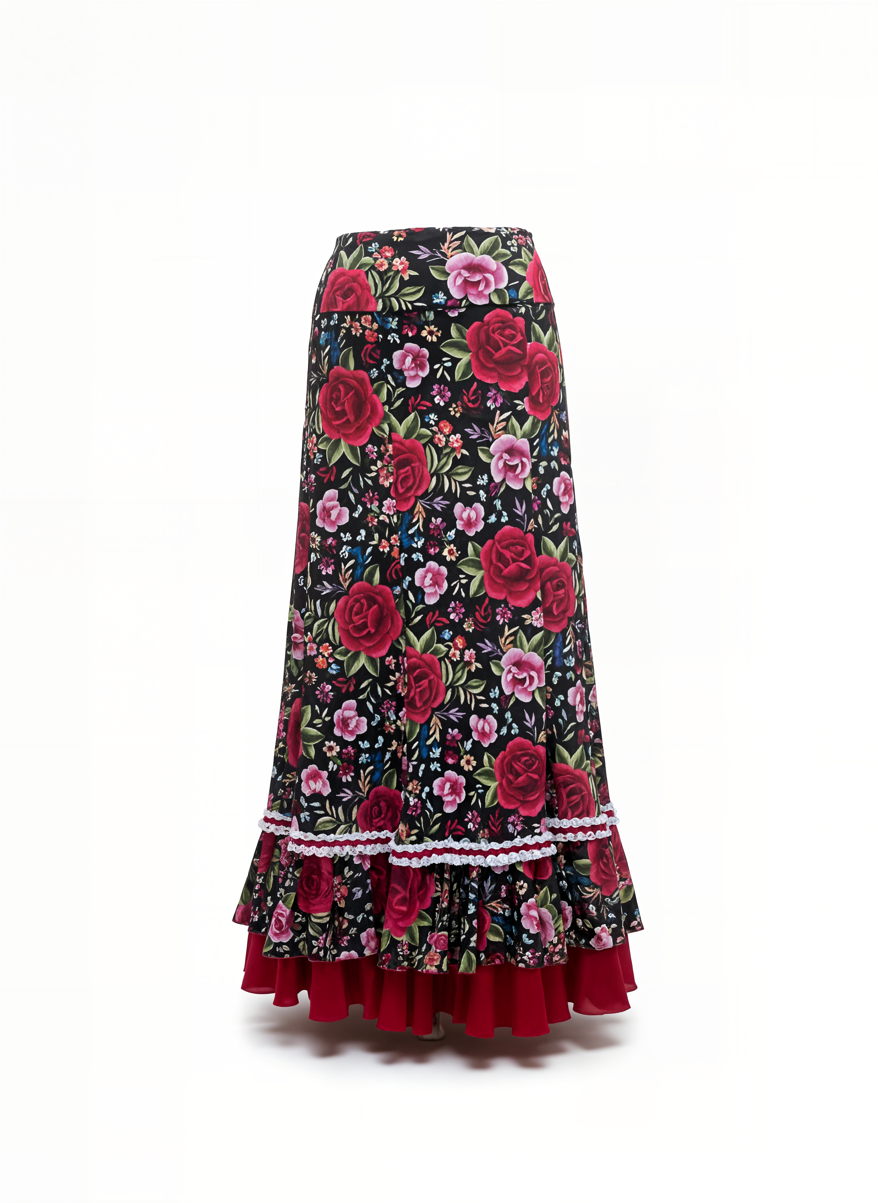 Falda de seis paneles en jersey estampado, decorada con dos volantes y ribete de galón. Elegante, cómoda, ligera y con un ajuste perfecto.