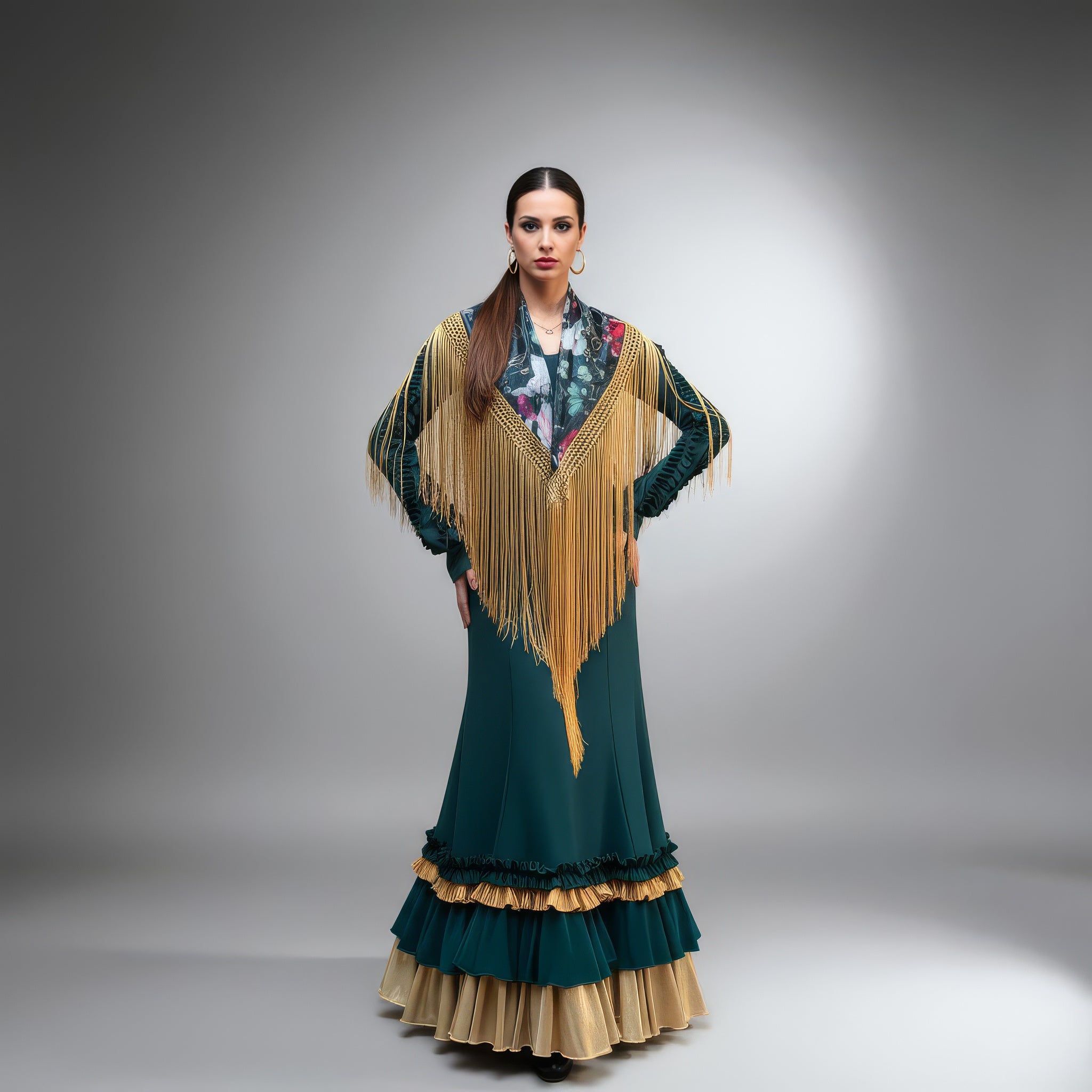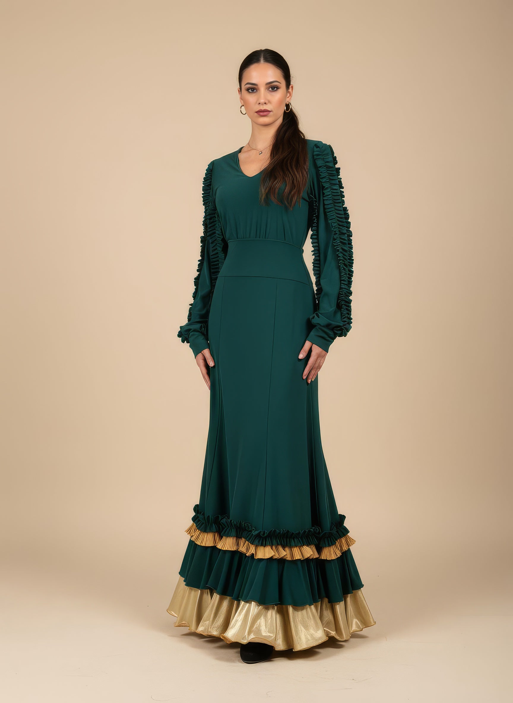 Completo elegante con blusa verde bottiglia a scollo a V e maniche lunghe con rouche. Gonna a vita alta con balze finali verde e oro. Realizzato in tessuto elasticizzato leggero, offre comfort e ottima vestibilità. Ideale per spettacoli ed eventi speciali.