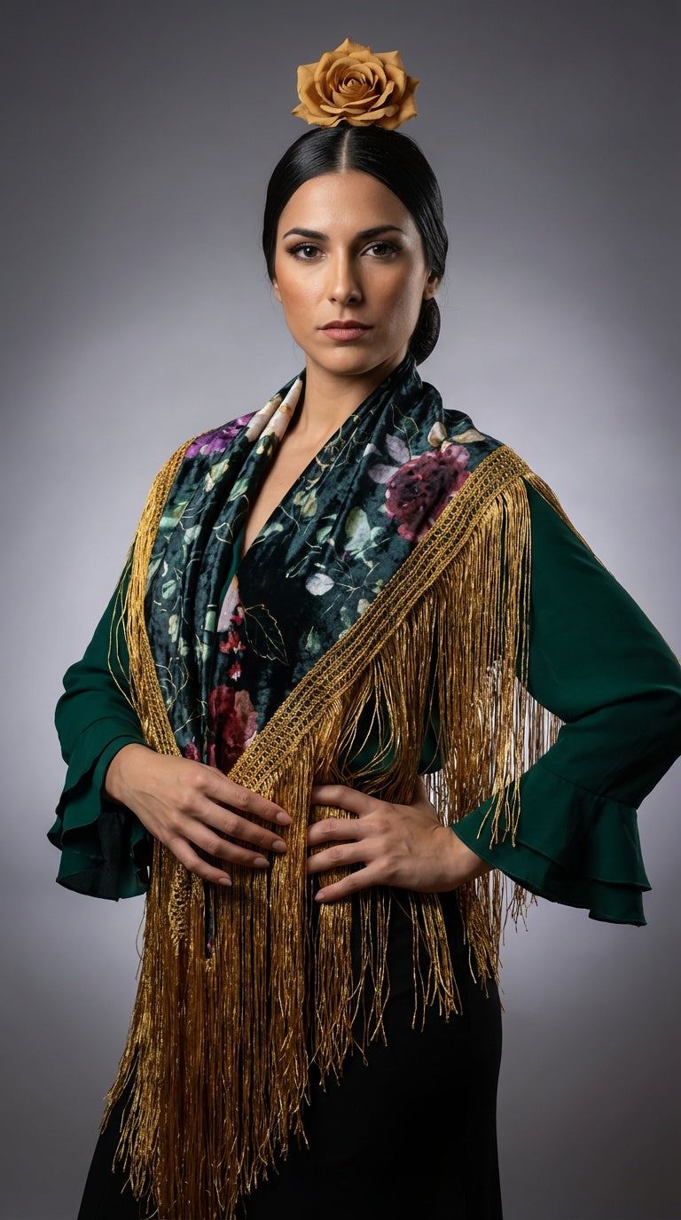 Mantoncillo flamenco realizzato in ciniglia elasticizzata fantasia, elegante e confortevole. Rifinito con flecos enredado da 40 cm perfetto per completare o rifinire i tuoi outfit da flamenco.